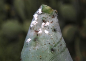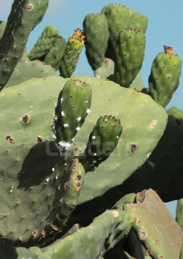 Originaire d’Amérique latine, la cochenille du cactus est un insecte suceur qui attaque les cladodes (raquettes) et prélève leur sève. La femelle, recouverte d’une masse cotonneuse blanche, se fixe sur la plante et pond plusieurs centaines d’œufs. Les jeunes larves mobiles colonisent rapidement les surfaces disponibles. Sur le plan physiologique, l’infestation entraîne jaunissement, nécrose, dessèchement et, à terme, la mort du cactus.