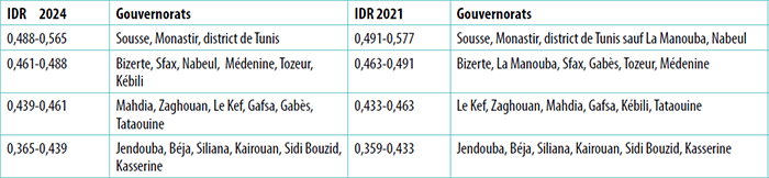 Sur le fond, le rapport de l’IDR 2024 n’apporte pas d’éléments nouveaux sur les déséquilibres ancestraux humains et socioéconomiques du territoire. Les régions côtières restent en 2024 les plus favorisées (les gouvernorats du district de Tunis, Sousse, Monastir) avec un IDR se situant entre 0,488 et 0,565 pendant que le Nord-Ouest et le Centre-Ouest (gouvernorats de Kairouan, Kasserine, Sidi Bouzid, Siliana, Béja, Jendouba) continuent à être les régions les moins développées avec un IDR se situant entre 0,365 et 0,439. Entre les deux, il y a un premier groupe composé des gouvernorats de Nabeul, Sfax, Bizerte Tozeur, Kébili et Médenine dont l’IDR se situe entre 0,461 et 0,488 et un second moins développé que le précédent composé des gouvernorats de Tataouine, Gabès, Gafsa, Mahdia, Zaghouan et Le Kef dont l’IDR se situe entre 0,439 et 0,461.