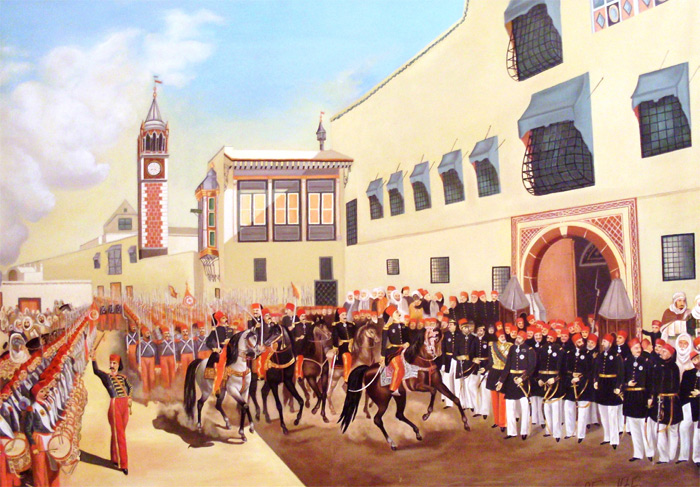 1856. Les troupes tunisiennes de Crimée défilant devant Mhammed Pacha Bey (copie d'un tableau de Moynier) victimes du choléra en Turquie, comme toutes les armées alliées, les soldats répandent le fléau à leur retour au pays.