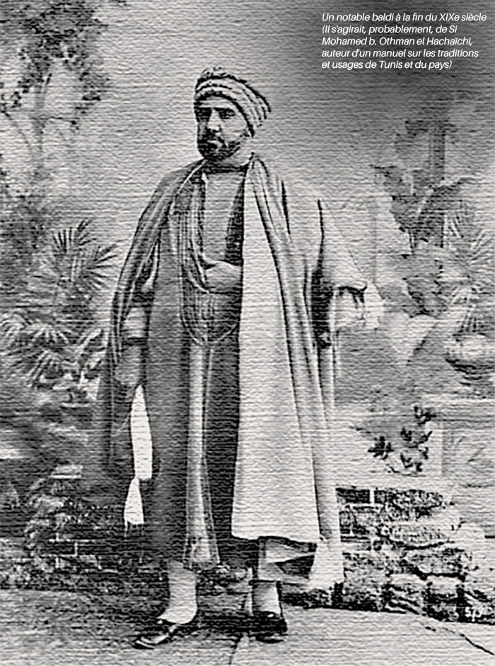Tunis était une médina, c’est- à-dire une cité musulmane importante à l’activité économique élaborée et abritant un important milieu politique, religieux et juridique. Un personnel d’encadrement urbain : amines (syndics) des métiers, cheikh de la médina et cheikhs des faubourgs s’activait sous l’étroit contrôle du pouvoir central. Ce milieu urbain lié à la cité, ses souks, ses mosquées constituait le monde baldi. Un monde intra-muros hiérarchisé en 1) A’yân el Baldiyya, c’est-à-dire les notables composés des imams des mosquées principales, des professeurs à la Grande mosquée, des chefs des zaouias urbaines, des grands marchands et des amines des métiers nobles (chéchias, soie, parfums, sellerie principalement), 2) et en baldiyya de moyenne condition mais à la légitimité citadine incontestée.