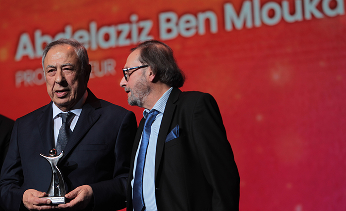 Justice rendue et hommage mérité : Abdelaziz Ben Mlouka, figure marquante du cinéma tunisien a été célébré par les Journées cinématographiques de Carthage,(JCC), lors de l’ouverture samedi soir 13 décembre 2025, à Tunis, de leur 36ème session. Sans jamais l’avoir réclamé, cet homme de grande patience, de discrétion et de modestie, se voit honoré par son pays et les cinéastes de plusieurs pays et générations. Ce soir-là, son bonheur était aussi immense que multiple. Sur le podium pour lui remettre le Tanit d'honneur, son ami de toujours Mohamed Damak, et dans la salle, parents, amis et "disciples". Ce Trophée hors classe, il le partage avec eux tous.