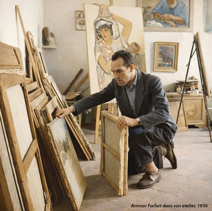 Figure majeure de la modernité artistique tunisienne, Ammar Farhat incarne une peinture profondément ancrée dans le réel social. Autodidacte, il a donné une visibilité inédite aux humbles — paysans, ouvriers, scènes de la vie quotidienne — par un dessin rigoureux et une couleur dense, sans exotisme ni folklorisation. Son œuvre, à la fois humaniste et engagée, fait le lien entre tradition locale et exigence universelle, et constitue l’un des socles éthiques et esthétiques sur lesquels s’est construite l’École de Tunis.