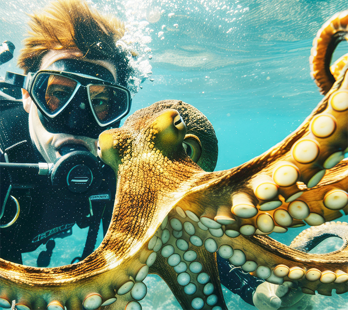 Le poulpe est souvent décrit comme l’invertébré le plus intelligent connu. Son cerveau est particulièrement complexe et comporte un centre nerveux principal qui coordonne l’ensemble du corps, tandis que chaque bras dispose d’une autonomie partielle, capable de réaliser des actions complexes indépendamment.Des expériences ont démontré sa capacité à résoudre des problèmes, à mémoriser des situations, à reconnaître des individus et même à utiliser des outils simples. Curieux et joueur, le poulpe explore son environnement avec une étonnante finesse et manifeste des comportements suggérant des formes de plaisir, de stress ou de détresse.